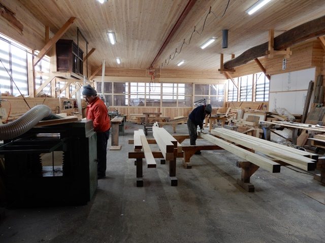 武部建設の作業場風景。OJTとして実習プログラムを策定し指導棟梁が日々の現場実習を行う