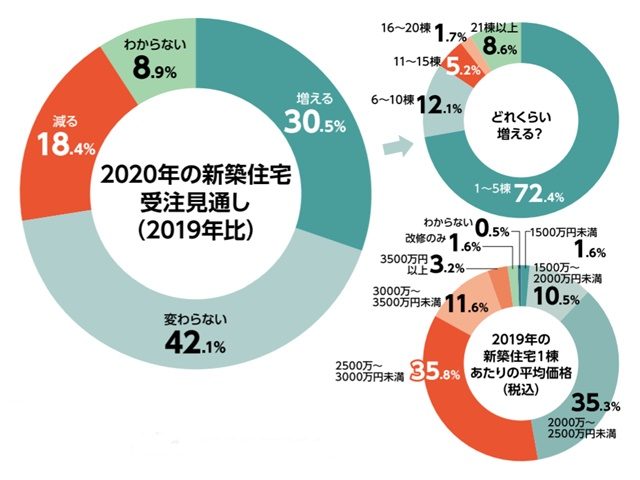 同アンケート調査結果で、2019年(1月〜12月※以下、全て同期間)の住宅新築受注(契約ベース)は、2018年に比べ「増えた」が 37.9%、「変わらない」が41.1%、「減った」は 21.1%だった。増えた棟数については「1〜5棟」が72.2%と最も多かった。