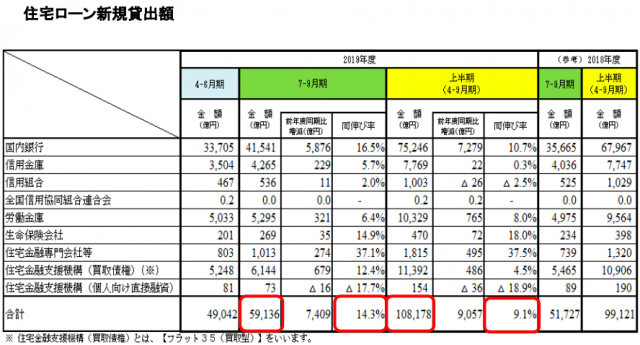 住宅金融支援機構(東京都文京区)は1月28日、2019年7~9月期の業態別の住宅ローン新規貸出額と貸出残高を発表した。主な機関等の住宅ローン新規貸出額は、前年同期比14.3%増の5兆9136億円だった。また、2019年度上半期(4〜9月)では同9.1%増の10兆8178億円となった。