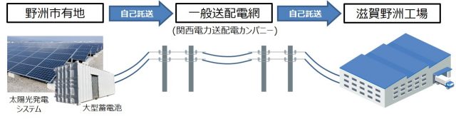 「自己託送」とは、企業などが自社工場などで発電した電力を一般送配電事業者の送電線を利用し、別の自社拠点に供給する制度。今回の実証では、野洲市が所有する2000m2の敷地に京セラ製太陽光発電システム約150kWを設置し、同システムで発電した再生可能エネルギーを関西電力の送配電網を通して約2km離れた京セラ滋賀野洲工場に供給する。