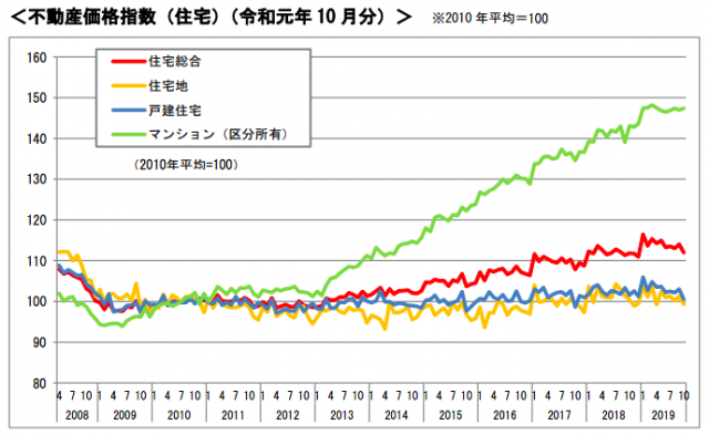 国土交通省は1月29日、2019年10月分の不動産価格指数(2010年平均を100として算出)を公表した。住宅総合の指数は前年同月比0.1%増の112.0となり、59カ月連続でプラス推移した。住宅地は同1.2%減の99.3、戸建住宅は同1.1%減の100.5、マンション(区分所有)は同3.0%増の147.4だった。