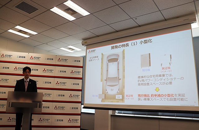 三菱電機は1月29日、電気自動車(EV)の電気を家庭で使うためのパワーコンディショナーについて、小型化と高効率化に成功したことを発表した。現行機より体積を約半減させた他、1kW以下の低出力時の電力損失を約30%削減したという。同日に東京都千代田区の同社本社で記者発表会を行った。