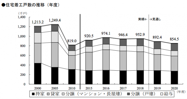 2019年度の住宅着工戸数は、分譲戸建が増加、持家、貸家、分譲マンションが減少し、全体で同6.4%減の89.2万戸となる見通し。2020年度も持家、貸家、分譲マンションの減少から同4.2%減の85.5万戸と予測する。