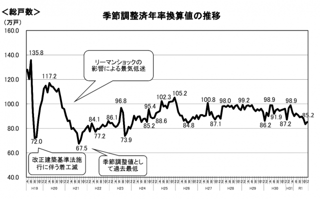 持家は8.7%減の2万2294戸で5カ月連続の減少。分譲住宅は5.1%減の2万1593戸で2カ月連続の減少。うち戸建ては4.5%減の1万2427戸で7カ月ぶり減少、マンションは6.2%減の8957戸で2カ月連続の減少となった。貸家は10.3%減の2万7611戸で16カ月連続の減少。季節調整済年率換算値は前月比0.5%増の85万2000戸で4カ月ぶり増となった。