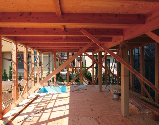 同社は注文住宅で坪平均80 万円の受注をとってきた工務店。平均的な坪人工は6人だ。そのためプロジェクトの応募にあたり、建築家の野沢正光さんと半田雅俊さんに依頼して坪50 万円の条件を満たせる専用住宅「木造ドミノ」を開発した。