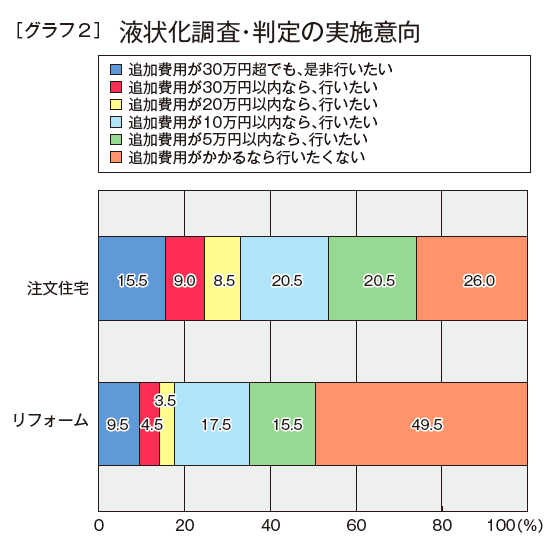 【グラフ2】は、液状化の発生危険度の判定に関して、今年9月、一般的な地盤調査に追加して液状化に関する調査の実施意向を聞いた結果。