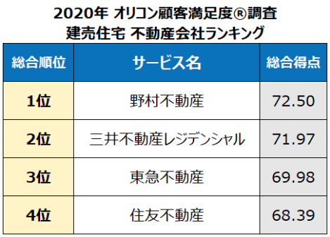 『建売住宅 不動産会社』ランキング(サンプル数=695人)では、「野村不動産」、「三井不動産レジデンシャル」、「東急不動産」が総合上位だった。「野村不動産」は評価10項目中8項目のほか、地域別の「関東」、男女別の「男性」「女性」でも1位となった。