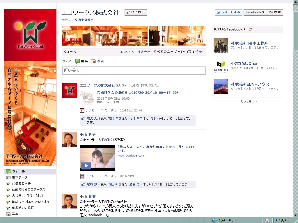 福岡県と熊本県を中心に高水準のエコハウスを供給するエコワークス(福岡県福岡市、小山貴史社長)。同社は今年7月、情報発信の方法を大きく変更。社長ブログ・施工ブログなど公式ブログで発信していた情報をフェイスブックに順次移行している。工務店のFacebook活用事例として、新建ハウジングプラスワン2011年11月号で紹介したその取り組みのさわりを紹介したい。