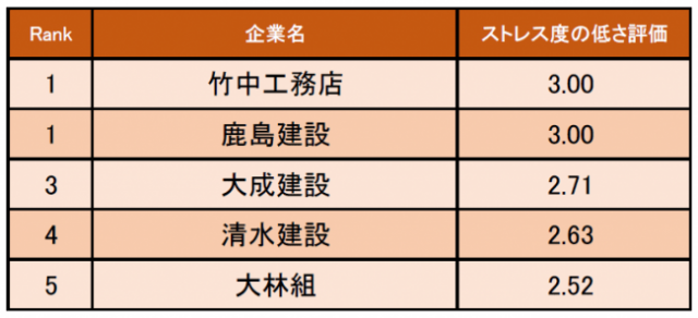 グローバルウェイ(東京都港区)が運営する企業口コミ・給与明細サイト「キャリコネ」は2月6日、「建設業界の“ストレス度の低い企業”ランキング」を発表した。1位は「竹中工務店」と「鹿島建設」、3位以下は「大成建設」、「清水建設」、「大林組」の順だった。