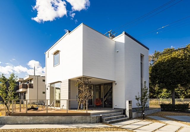同住宅では、同社独自の耐震住宅工法「テクノストラクチャー」の強度を生かし、玄関先に広い軒下を設計。軒下と庭のデッキ、LDKにつながる土間までがフラットになる間取りのため、それぞれへの移動がスムーズに行え、屋内外のつながりを楽しむことができる。2階部分にはプライバシーを保ちながら屋外でくつろげる場として、壁で囲ったバルコニーを設置。内外装に同一素材を使用するなど、しつらえでも屋内と屋外の一体感を演出している。