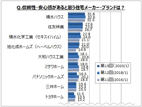 信頼性・安心感については積水ハウスが前回調査比0.8ポイント減の31.8%。次いで住友林業が横ばいの27.6%、積水化学工業(セキスイハイム)が1.1ポイント減の22.9%、旭化成ホームズ(ヘーベルハウス)が1.0ポイント増の21.0%、大和ハウス工業が2.5ポイント減の18.1%だった。