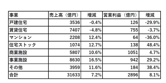 事業別の売上高と営業利益は下記の通り。大和ハウス単独での戸建ての売上は注文で41戸減の4416戸、2.3%減の1769億円、分譲は68戸減の1371戸、18.3%減の304億円。住宅ストックは売上高が約1割、営業利益は約5割増。マンションは増収減益だった。賃貸住宅は管理が増収となったものの、請負・分譲と開発物件売却は減収だった。