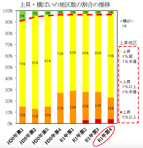 住宅系地区では、前期からの変化が見られず、「錦町」(仙台市)、「福島」(大阪府)、「天王寺」(同)が3〜6%の上昇、「大濠」(福岡市)が横ばい、ほかが0〜3%の上昇となった。