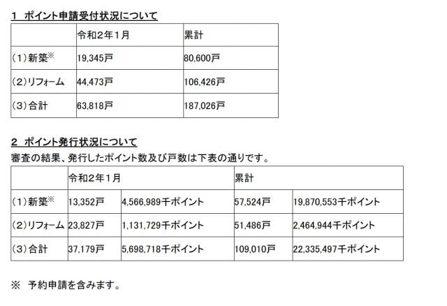 国土交通省は2月18日、消費税率10%への引き上げ後の住宅購入等を支援する「次世代住宅ポイント制度」の1月末実施状況を公表した。