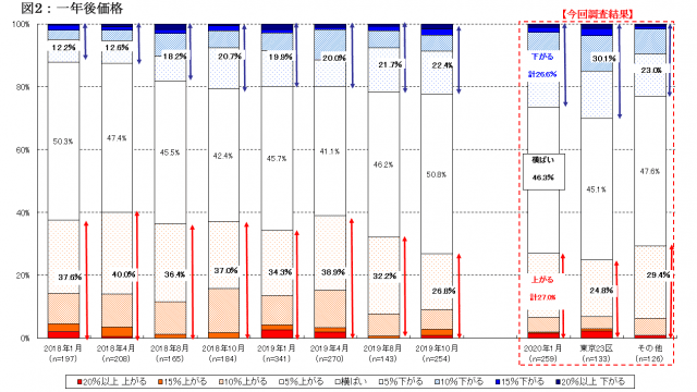 スタイルアクト(東京都中央区)が運営する不動産のセカンドオピニオンサイト「住まいサーフィン」はこのほど、48回目となるマンション購入検討者の定例意識調査を行い、その結果を発表した。マンションの一年後価格については、26.6%が「下がる」と予測。オリンピック開催を間近に控え、都区部を中心に下落を予想する割合が過去最高となった。