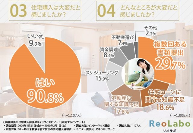 住環境ジャパン(東京都世田谷区)は2月21日、30~40代未就学児子育て世代の住宅購入経験者1107人を対象に実施した「住宅購入前後のギャップとエピソード」に関する調査結果を発表した。それによると、「住宅購入は大変だ」と感じた人は90.8%にのぼることがわかった。具体的には「複数回ある書類提出」が29.7%、「住宅ローンに関する知識不足」18.6%、「不動産に関する知識不足」17.8%、「スケジューリング」15.9%、「資金調達」8.4%などがあげられた。
