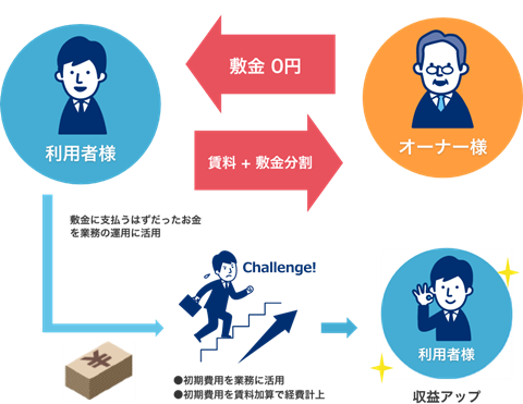 同サービスのしくみは、敷金を0円にして、その金額分を分割し毎月の賃料に加算するというもの。月額の賃料は1~2割程高くなるが、利用者の手元には敷金として支払う予定だった資金が残るため、業務運用に活用でき事業のスピードアップが図れるという。また、オーナーにも、本来敷金は預かり金のため使うことができないが、敷金を分割で賃料に含めているため物件の運営資金として利用できるというメリットが生まれる。