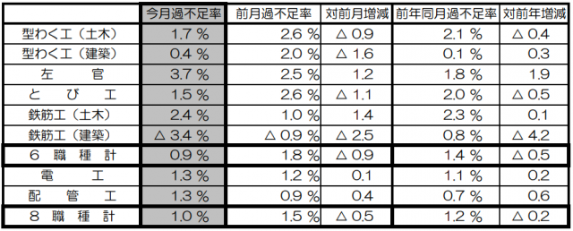 職種別の状況では、鉄筋工(建築)を除く全職種が不足となった。不足が最も大きかったのは左官(3.7%)だった。地域別では、沖縄県を除く全地域で不足となった。最大は九州(3.9%)、ついで東北(3.0%)、北海道(2.1%)、北陸(2.1%)などとなった。