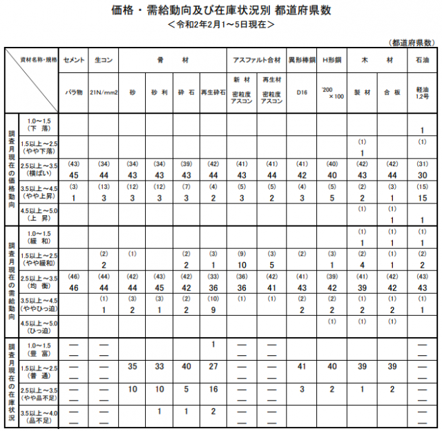 同調査は、建設資材の供給側(生産者、商社、問屋、販売店、特約店)と需要側(建設業者)から約2000社のモニターを選定し、対象資材の価格・需給動向と在庫状況について調査を実施したもの。