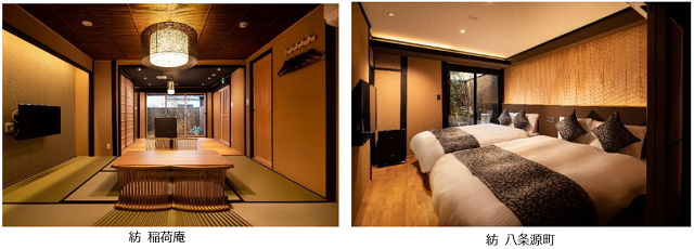 「紡 稲荷庵(つむぎ いなりあん)」(京都市伏見区)と「紡 八条源町(つむぎ はちじょうみなもとちょう)」(京都市南区)は、両社が2019年6月に事業協定を締結した「京町家再生共同事業」の第1号、第2号物件。いずれも昭和25年以前に建てられた京町屋で、梁や柱を可能な限り活かしつつ非日常感を感じられる施設に改装した。今後、共同で年間8棟の京町屋再生に取り組み、地域の活性化と魅力ある京都の街並みを次世代に紡いでいくとしている。