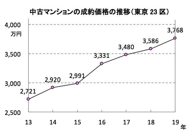中古マンションの首都圏平均成約価格は2699万円。前年比で2.8%下落し、2年連続でマイナスとなった。エリア別では、神奈川県・埼玉県・千葉県の3エリアが下落し、いずれも6年ぶりのマイナスとなった。一方、2018年に唯一マイナスだった東京都下は同7.4%の上昇を記録。東京23区は同5.1%増の3768万円でプラス推移を続けており、6年前と比較すると1000万円超のプラスとなっている。