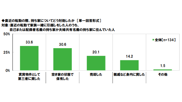 東急住宅リース(東京都新宿区)と東急社宅マネジメント(東京都新宿区)はこのほど、「ビジネスパーソンの転勤事情に関する調査」を実施し、その結果を発表した。転勤時に持ち家に住んでいた人を対象に、住まなくなった住宅についてどう対処したか尋ねたところ、「賃貸物件として第三者に貸した」(33.6%)と答えた人が最も多かった。次いで、「空き家の状態で保有した」(30.6%)、「売却」(20.1%)、「親戚など身内に貸した」(14.2%)となった。