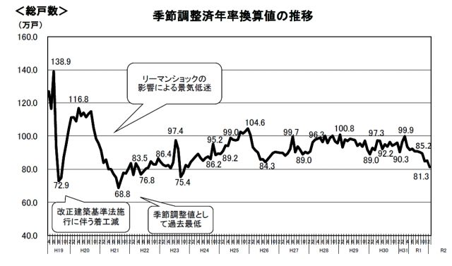 持家は6カ月連続の減少。2ケタ減は2015年1月の18.7%減以来5年ぶり。分譲住宅は14.6%減の1万7856戸で3カ月連続の減少。うち戸建ては2.8%減の1万881戸で2カ月連続減少、マンションは27.5%減の6789戸で3カ月連続の減少となった。貸家は2.5%減の2万4147戸で17カ月連続の減少。アパートローン審査の厳格化などの影響が続いているが、1ケタ減は2019年3月の4.5%減以来10カ月ぶり。季節調整済年率換算値は前月比4.6%減の81万3000戸で2カ月ぶり減となった。