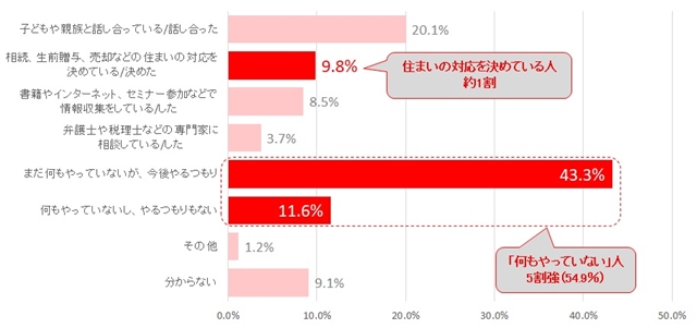 解体工事・外構工事の一括見積もりWebサービスを運営するクラッソーネ(名古屋市)はこのほど、住居用不動産を所有する50歳以上の人を対象に「住まいの終活」に対する意識調査を実施し、その結果を発表した。「相続発生前の所有者やその相続予定者が元気なうちに、将来、住まいをどうするのかという選択肢を考えること」を指す「住まいの終活」という言葉について、認知度は30.6%にとどまった。「住まいの終活」の意味を説明した上で必要性を質問したところ、80.5%が「必要だと思う」と回答。「住まいの終活」を知っている人でも、「相続・生前贈与・売却など、住まいの今後の対応を決めている」割合は9.8%で、「何もやっていない」が54.9%にのぼった。