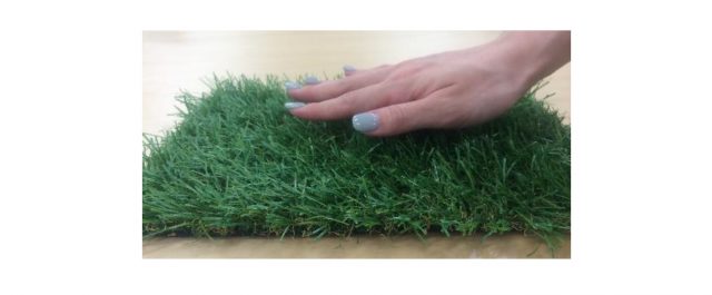 ポリエチレン素材のストレートタイプと、ポリプロピレン素材で縮れ形状のクリンタイプの芝糸(パイル)を組み合わせ、基布上に縫合。異なるタイプの芝糸が支え合うことにより、柔らかな質感と触り心地を実現したという。