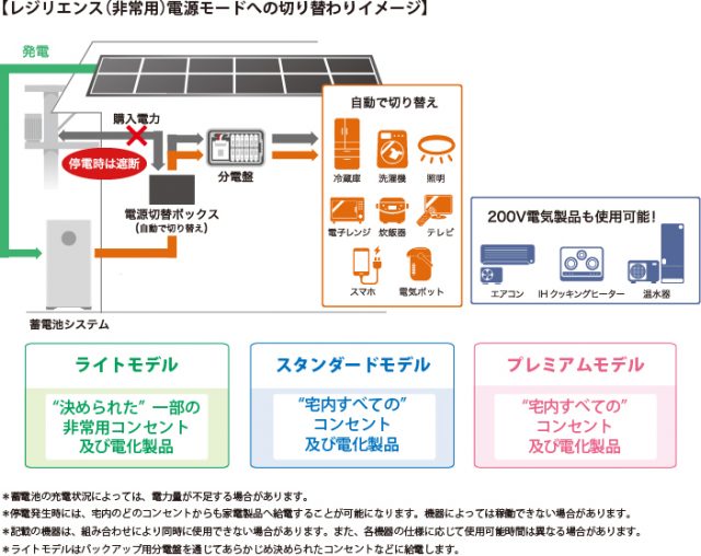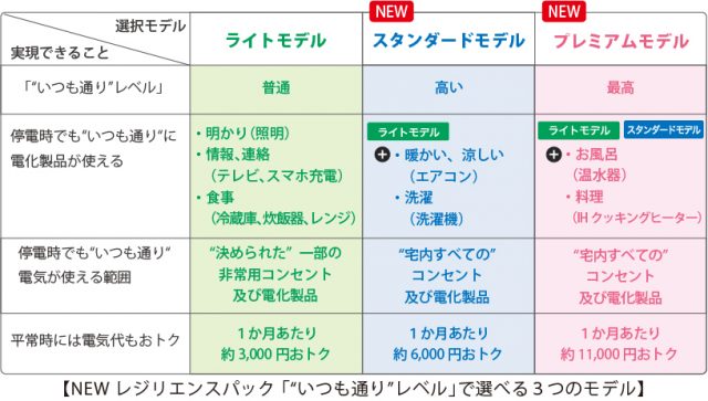 停電時に使える電化製品やコンセントの範囲を「”いつも通り”レベル」として設定。そのレベルに応じて3種類(ライト、スタンダード、プレミアム)から選べるようにした。