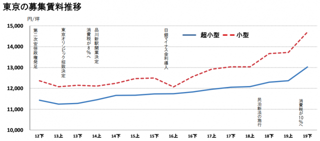 東京の小規模オフィスの賃料は、5~25坪の「超小型」が前期比5.3%増の1万3026円/坪、25~50坪の「小型」が同7.1%増の1万4702円/坪となり、12年下期以来最高を記録した。「超小型」の賃料は全20エリア中19エリアで前期を上回り、「小型」は「浜松町・田町」「池袋」「品川・五反田・大崎」の3エリアでは同10%超の大幅上昇となった。