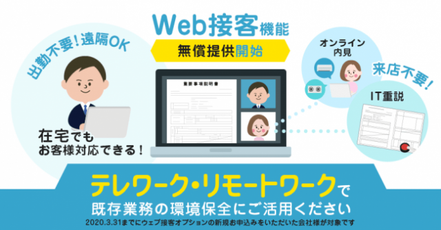 不動産業に特化した業務支援サービスを提供するいえらぶGROUP(東京都新宿区)は3月2日、新型コロナウイルスの感染拡大による在宅勤務・リモートワーク推奨を受け、オンライン内見やIT重説によってリモートでの住まい探しを支援する「WEB接客」機能を不動産会社へ無償提供するキャンペーンを開始した。同機能を新規で導入する不動産会社が対象。