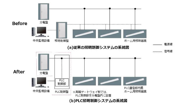 動作は、駅全体の中央監視設備からの指示を受け、PLC制御部が調光調色信号をPLC信号に変換して電力線に重畳し伝送。その後、PLC通信部内蔵ホーム用照明器具が、受信したPLC信号を調光調色信号に再変換して指示した点灯状態(色温度、明るさ)を再現する。各照明器具にアドレスが割り当てられるため、信号線を付け替えなくても、照明器具個別に点灯状態を変更することができるという。