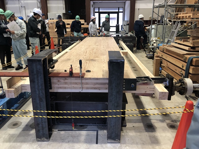 CLT実大パネルの水平加力試験の様子(富山県農林水産総合技術センター木材研究所)