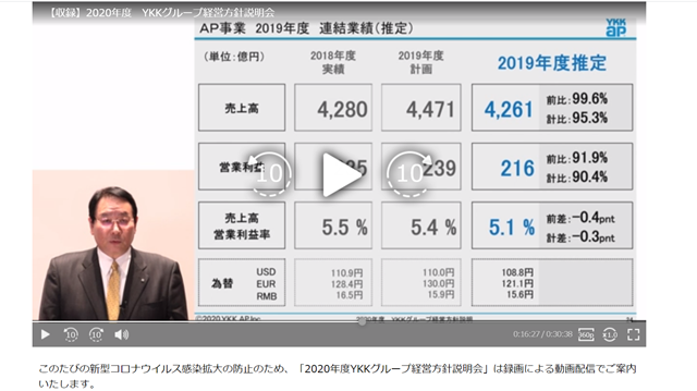 YKKグループは3月5日、「2020年度YKKグループ経営方針説明会」を開催し、2019年度の業績見込みと2020年度の経営方針を発表した。新型コロナウイルス感染拡大防止のため、説明会は録画による動画配信という異例の対応をとった。