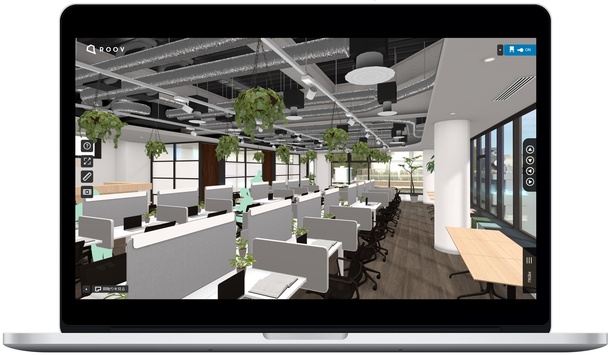 同社のVR内覧システムは独自開発の3Dエンジンを搭載し、特別なデバイスやアプリを使用することなく、一般的なパソコン・スマートフォン・タブレット端末のWebブラウザでVR内覧が可能。CAD図面から室内空間の3DCGを作成することにより、未竣工のオフィスだけでなく、入居中のオフィスでも退去申込時点からVR空間を活用したリーシングに着手できる。