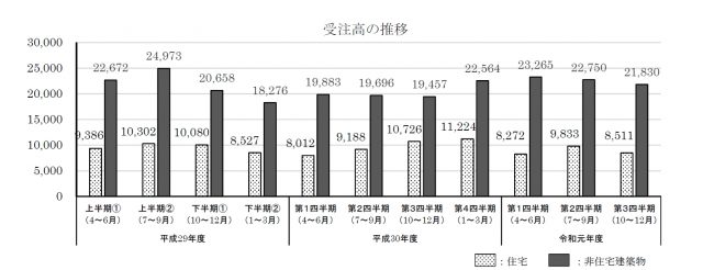 住宅の用途・構造別は木造戸建てが23.5%減の3964億円で、次いでコンクリート系構造の共同住宅が1.5%減の3527億円。発注者は個人が27.7%減の5385億円、管理組合が1.5%減の1185億円。