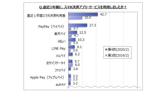 マイボイスコム(東京都千代田区)はこのほど、4回目となる「モバイル決済」に関する調査を実施し、その結果を発表した。直近1年間にスマホ決済アプリ・サービスを利用した人の割合は42.7%と、2019年調査(20.0%)と比べて大きく増加した。利用したスマホ決済は、「PayPay」が27.3%、「楽天ペイ」が12.5%、「d払い」が10.3%、「LINE Pay」が9.1%だった。