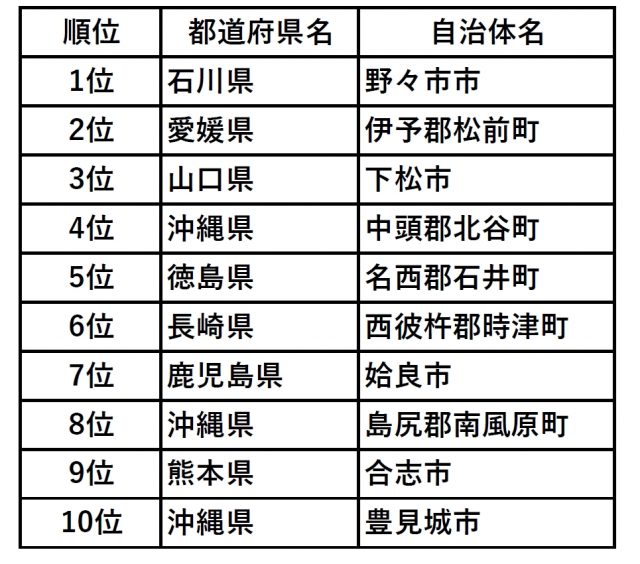 トップ10は下記の表の通り。野々市市は住民からショッピングセンターなど商業施設が充実し、利便性が高いことなどが評価された。金沢市の西側に隣接し、電車やバス、金沢バイパスなどが整備されている。2位は愛媛県伊予郡松前町、3位は山口県下松市。いずれも買い物など利便性への評価が高い。松前町は買い物など利便性の他、隣接する松山市より住民税が安いとの声もあった。