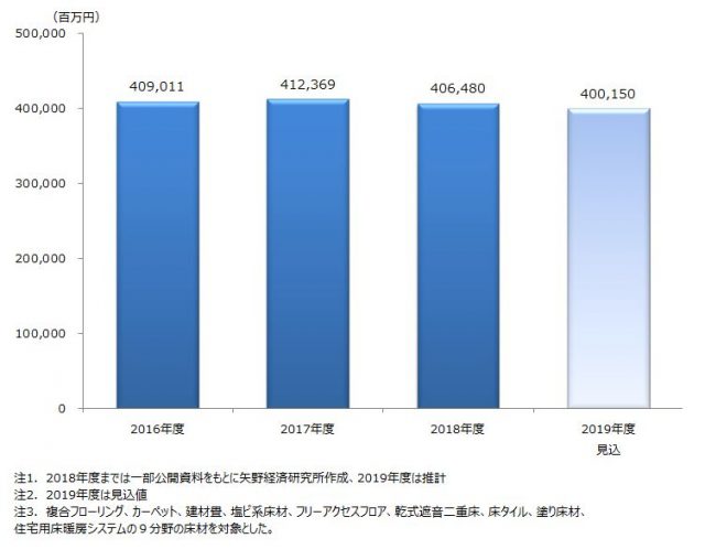 矢野経済研究所(東京都中野区)は3月11日、国内の床材市場(複合フローリング、カーペット、建材畳、塩ビ系床材、フリーアクセスフロア、乾式遮音二重床、床タイル、塗り床材、住宅用床暖房システムの9分野)の調査結果を発表した。2018年度の市場規模は前年度比1.4%減の4064億8000万円と推計した。