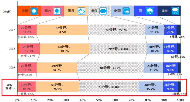 2020年度の業界展望は、全197分野のうち「晴天」と予想される分野が75分野(前年度比+3分野)、「雨天」と予想される分野が51分野(同+7分野)。「晴天」は2年ぶりの増加となるが増加幅は緩やか。一方で「雨天」が50分野を上回るのは2016年度(65分野)以来4年ぶりとなる。また「雨天」の7分野増加は、近年では消費税が8%に引き上げられた翌年の2015年度(同+8分野)に次ぐもの。