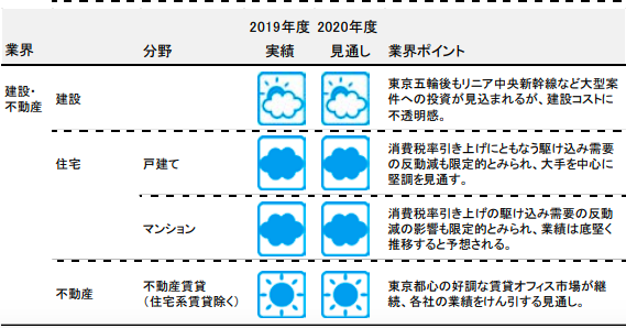建設・不動産業界の2020年度は、建設分野が「晴天(薄日)」、戸建て住宅とマンションが「曇り」、不動産賃貸が「晴天(晴れ)」となり、各分野とも前年度の業況を維持する見通し。