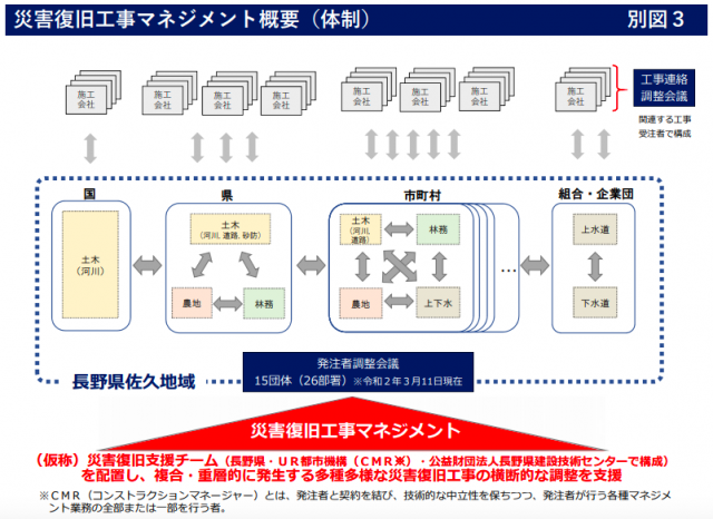 同業務では、佐久地域における災害復旧工事の効率的・効果的な執行及び早期完了を目的に、15団体におよぶ発注者間や複合・重層的に発生する多種多様な復旧工事間を横断的に調整する。今年4月に予定する長野県との契約締結後、URとして災害復旧工事マネジメント業務を担う職員を現地に配置する。