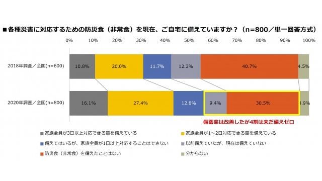 災害に対応するための防災食(非常食)の備蓄率は全国平均で56.3%。2018年調査と比べ13.8ポイント上昇するも、約4割の家庭では防災食を全く備えていないこともわかった。防災食の備蓄率が最も高いエリアは関東地方(73.0%)。最も低いエリアは中国地方(36.0%)だった。