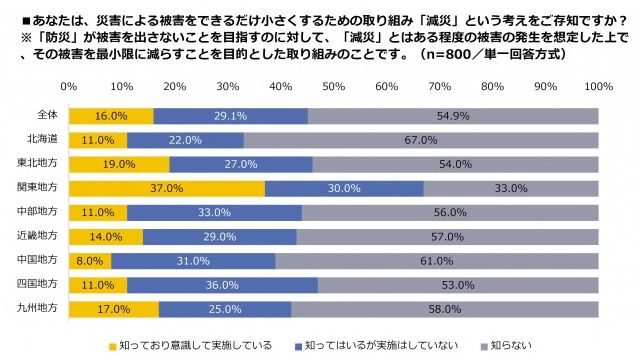 ミドリ安全(東京都渋谷区)が運営する安全靴・作業着などの通販サイト「ミドリ安全.com」はこのほど、子どもと同居する母親を対象に「家庭の防災・減災対策」に関する実態調査を実施し、その結果を発表した。災害時の被害を最小限に抑える取り組みを指す「減災」の実施率は全国平均で16.0%。関東地方が最も高く、37.0%が実施していることがわかった。