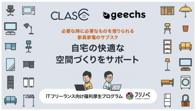 家具・インテリア・家電のサブスクリプションサービスCLAS(クラス)を運営するクラス(東京都目黒区)は3月12日、ギークス(東京都渋谷区)と提携し、ITフリーランスに向けてCLASのサービスを優待価格で提供開始する。