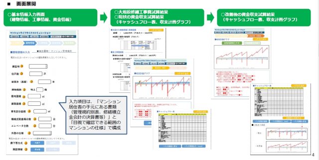 管理組合が大規模修繕事業者から提案された金額とシミュレーション結果を比較検証できる他、次回の大規模修繕工事までに、計画的に修繕積立金を積み上げられるよう誘導しやすくなる。また試算の結果、修繕積立金が不足しているマンションに対しては、ローンの利用で適正な時期に必要な工事を行うことによる費用面、性能面、資産価値上の有用性も示すことになる。