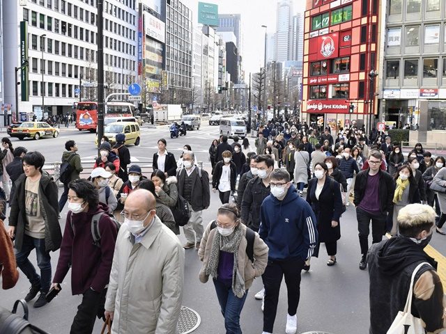 新型コロナウイルスの感染が拡大する中、マスクを着用して東京・新宿を歩く人たち=3月3日午後(写真提供:共同通信社)
