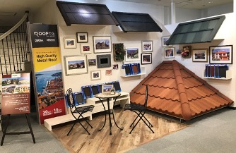 ヨーロッパにある住宅の中庭をイメージした空間とし、屋根材を貼った庇状の展示物3台、寄棟架台1台、写真、カットサンプルで型と色を確認することができる。