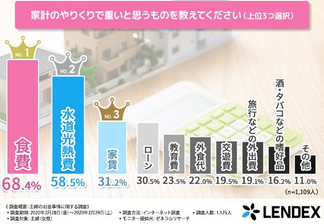 LENDEX(東京都渋谷区)は3月13日、主婦(女性)1125人を対象に実施した「主婦のお金事情に関する調査」の結果を発表した。それによると、家計のやりくりで重いものとして「食費(68.4%)」、「水道光熱費(58.5%)」、「家賃(31.2%)」が上位3つにあげられた。